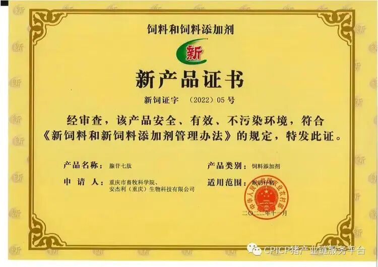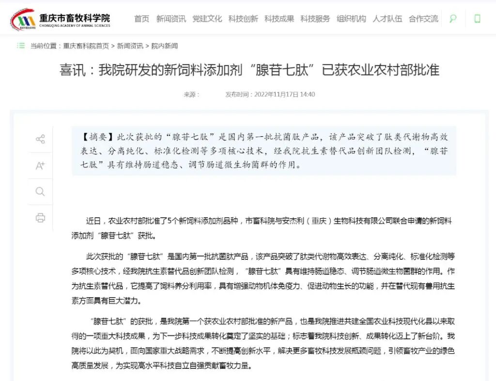 2022年的11月3日,重庆市畜牧科学院还在官网上公布了一个喜讯,称“农业农村部批准了5个新饲料添加剂品种,重庆市畜科院与安杰利(重庆)生物科技有限公司联合申请的新饲料添加剂‘腺苷七肽’获批,这是我院第一个获农业农村部批准的新产品。重庆市畜牧科学院官网喜报